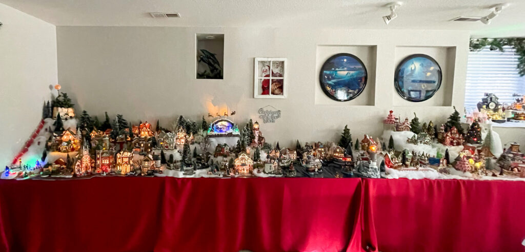 Although it is a lot of work, it is just so much fun to hand that switch to a little one and watch their eyes light up when it comes to life. I always ask them, if they could live in the village, where would they want to be? You would think they would all say Santa’s house. Most do but I have had a few tell me they want to live by the park, or in the cabin in the woods. I tell them we would choose a house by the sea with the beach outside our door. At any rate, we have had so many fun conversations over the years.